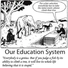 Il nostro sistema educativo“Per una selezione equa tutti devono prendere lo stesso esame: per favore sali su quell'albero".Tuttisonoungenio.Masegiudichiunpesce dallasuacapacitàdiarrampicarsisuunalbero, vivràtuttalasuavitacredendodiessere stupido.
